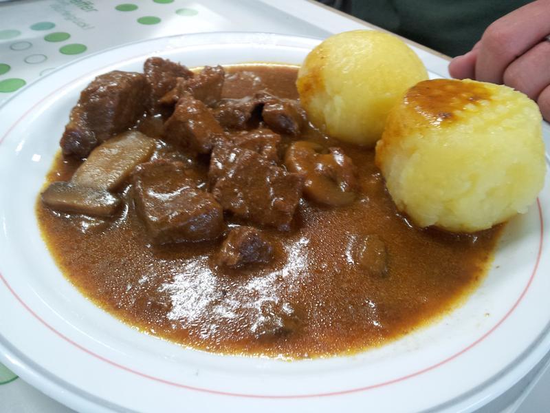 | Mit Spaetzle oder Pommes heute. Hat sogar ein bisschen nach Bier geschmeckt, gute Portion. Insgesamt sehr zu empfehlen. | |