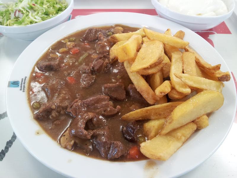 | Das Geheimnis um die "Leipziger Schwarzbierpfanne" die es scheinbar nur beim Studentenwerk ER-N gibt ist geloest: Anderswo wuerde man das Gericht einfach "Gulasch" nennen... Immerhin: Es hat nicht schlecht geschmeckt. | |