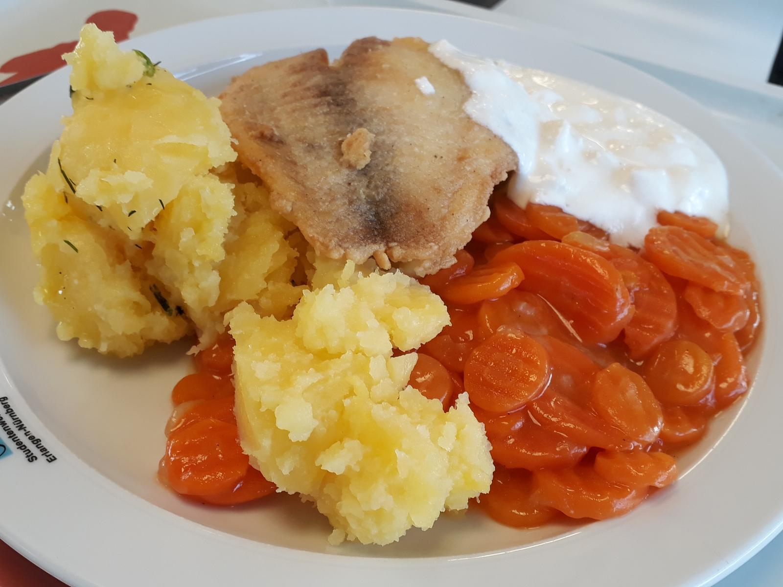 | Dienstagsfisch wie immer episch, die Karotten waren auch gut essbar, der Rest war leider eher schlonzig. Die Kartoffeln hatten die typische Mensakartoffelkonsistenz. Der Dip war eklig. | |