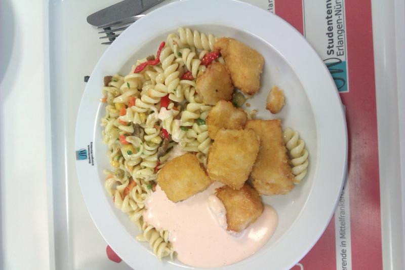 | Obwohl ich um 13:55 in die Mensa kam, waren die Nuggets frisch und die Soße auch lecker. Leider waren die Nudeln kalt. | |
