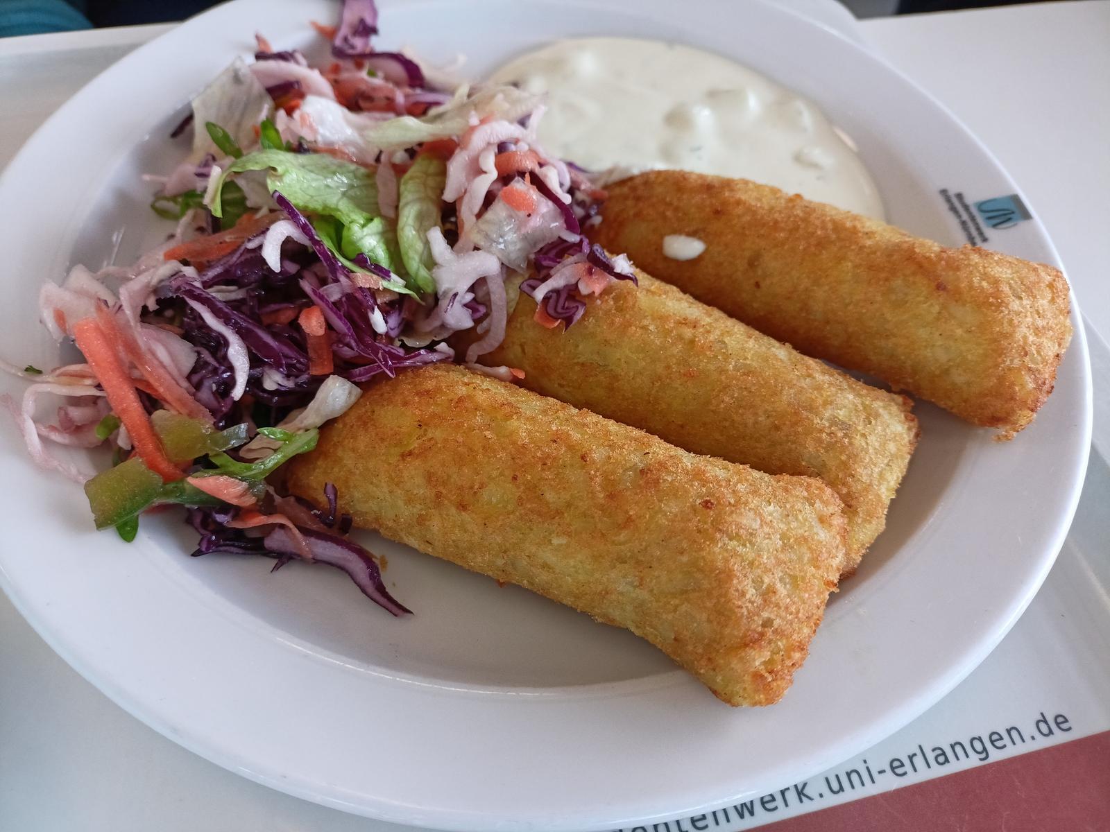 | Ein Gericht im Mensadurchschnitt. Die Kartoffeltaschen sind die aus der Tiefkühltruhe des Supermarktes gewohnten, leider aber alles andere als knusprig gebraten. Der Quark-Dip ist eine lustige Idee, schmeckt aber letztendlich fast genauso wie der Frischkäse im Innerern. Lätscherter Einheitsbrei also. Portion mit Salat ist okay, und der Preis dafür geht in Ordnung. Nichts tolles, aber es ist warm und sättigt. | |