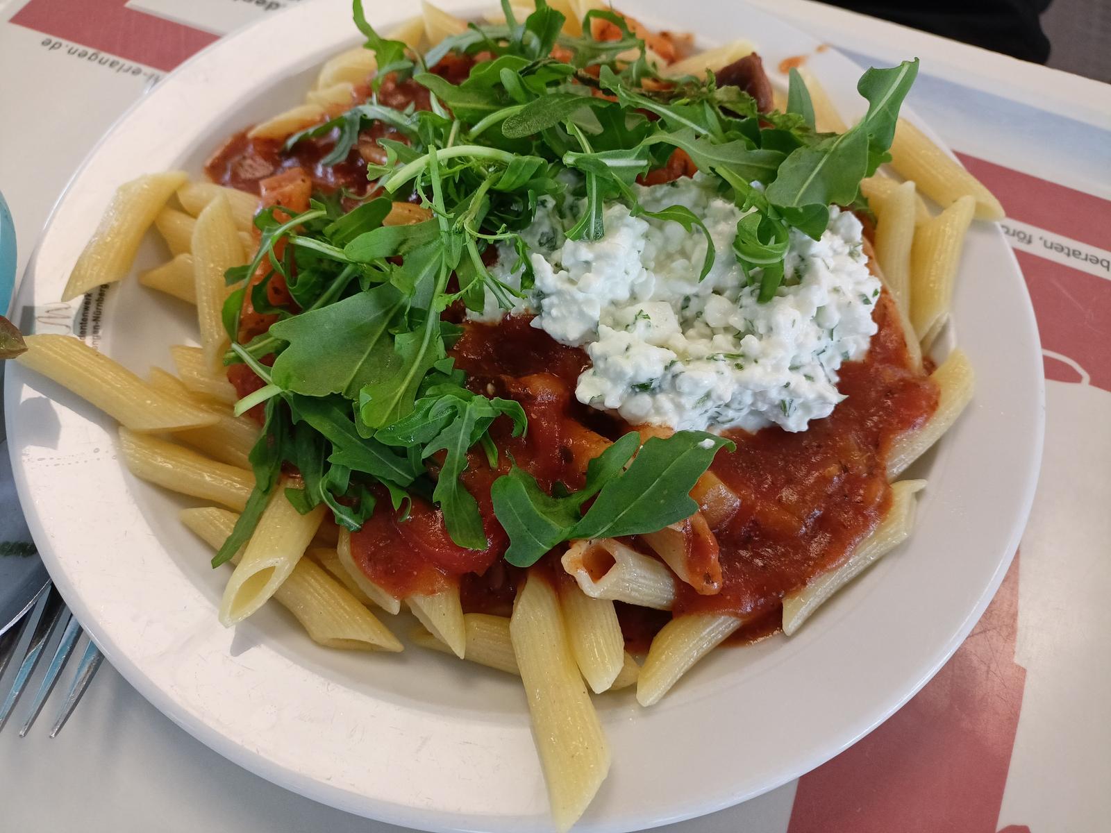 | Eine sehr gelungene Komposition der Mensa, es waren Gemüsestücke zu erkennen und erschmecken und auch die Kombination mit dem Rucola und Hüttenkäse ist wahrlich ein Meisterwerk der Mensakulinarik. Definitiv empfehlenswert, auch preisleistungtechnisch. | |