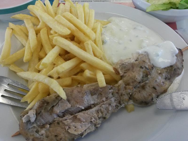 | Ein Hauch von mediterraner Luft umströmte mich alsbald ich den Teller von der Theke nahm. Das Fleisch war tatsächlich gut, jedoch nicht mit Souvlaki vom Griechen meines Vertrauens vergleichbar. Pommes wie immer und das Tzatziki hätte Herkules nicht stolz gemacht. | |