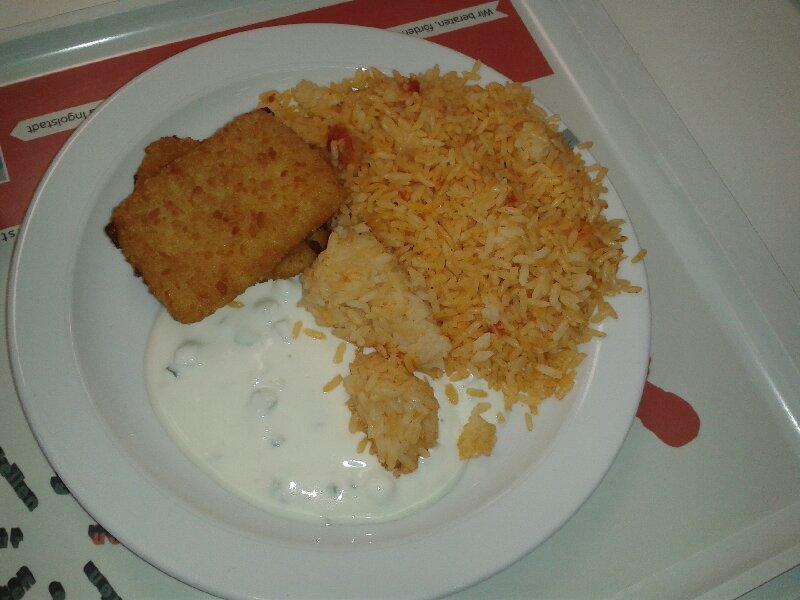 | Hm ja, Dip war heute so ne komische pinke Sose und Beilage Kartoffel, wenigstens essbar. | |