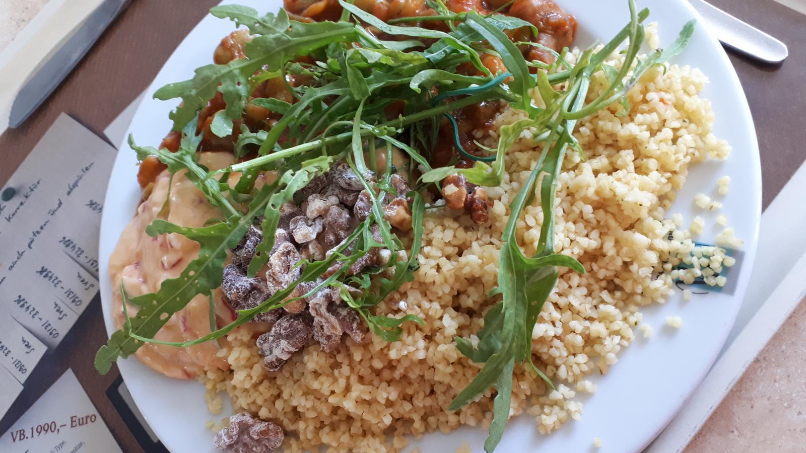 | [Cafeteria Hohfederstraße TH Nürnberg] Die Portion war groß, die Bedtandteile sehr lecker, endlich mal ausreichend Proteine im veganen Essen und vom Radieschendip hätte ich gern mehr gehabt. Und der Haushaltsgummi im Rucola wsr bestimmt auch kein Bug, sondern ein Feature. ;) 5/5 | |