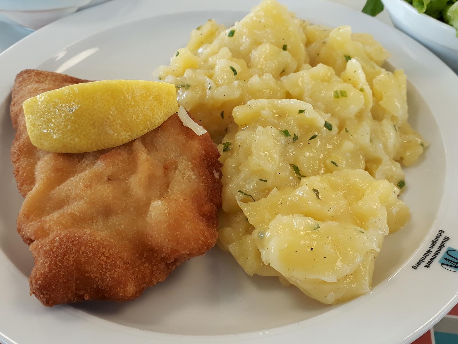 | Das Cordon Bleu schmeckte gut und war für Mensaverhältnisse eine ordentliche Portion. Der Kartoffelsalat war ein kleiner Haufen, aber frisch mit Petersilie angerichtet. Von der Hüttenkäse Füllung muss man ein Fan sein. Der Schinkenanteil war vermutlich schmackhaft angereuchert. Alles in Allem ein sehr leckeres Gericht. | |