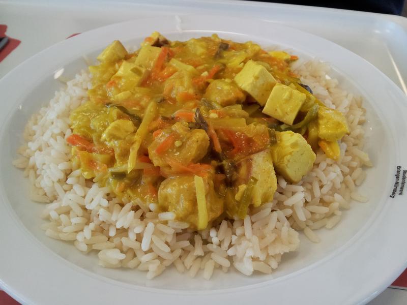 | war eigentlich echt nichts auszusetzen. ein wenig scharf, relativ lecker, gut gewuerzt. reis wie immer ein wenig zu verkocht und mit reismehl verpappt. da ich relativ spaet kam und noch ein guter bottich da war geizte man auch nicht mit der portion. fuer 1.60 gut satt geworden und es gab nix zu motzen => 4/5 | |