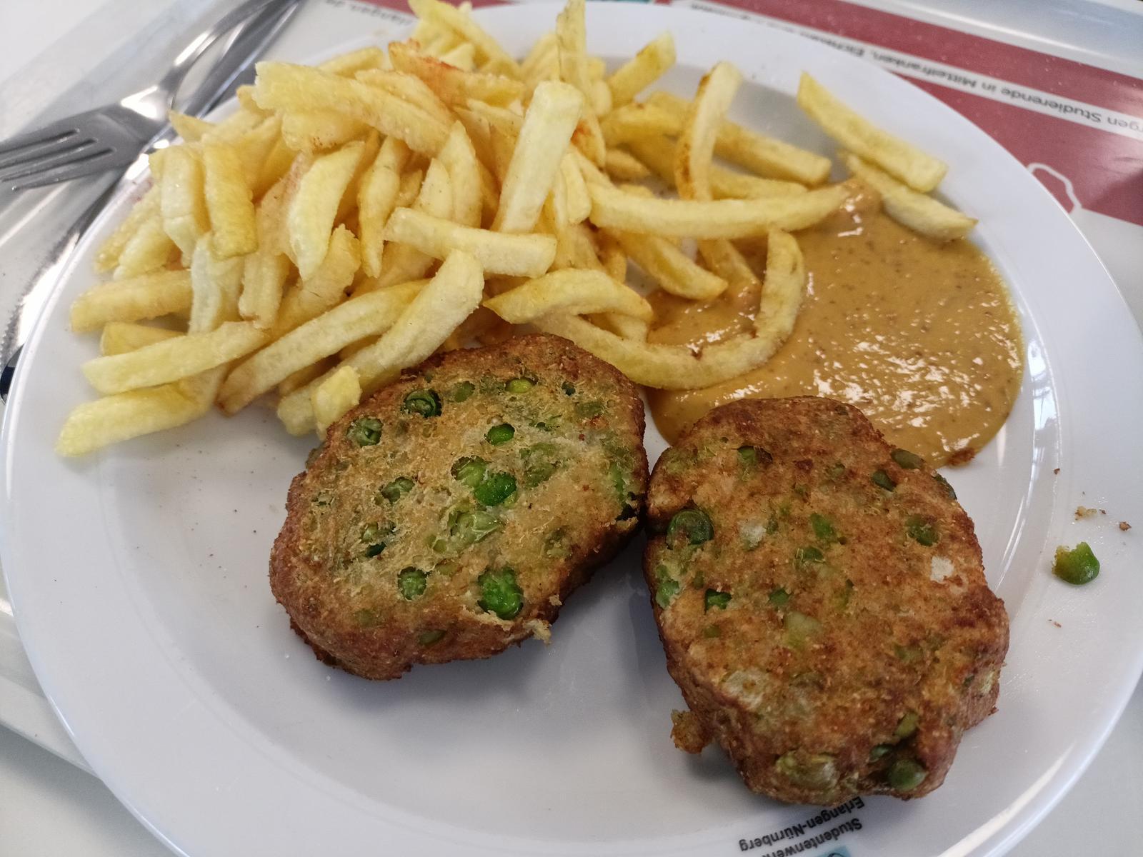 | Die Frikadellen sind zwar immer etwas trocken, aber geschmacklich überraschend gut. Das Senf-Sößchen ist meines Erachtens der beste Dip, den die Mensa zu bieten hat. | |