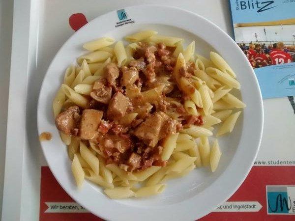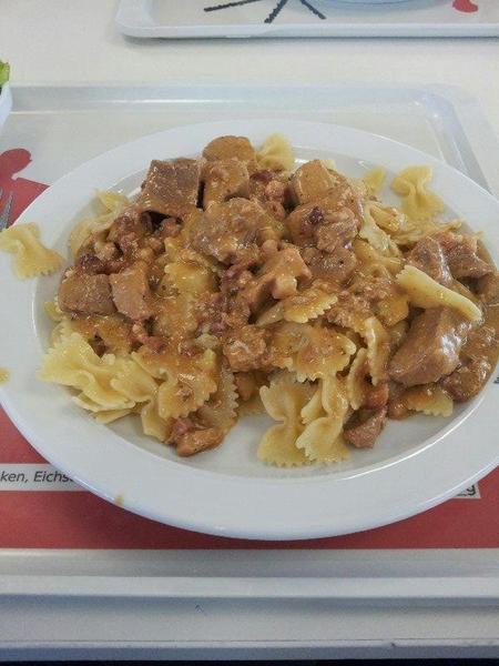 | War eigentlich ein recht gutes Essen. An sich hat es sich nur bezüglich der Gewürze und des Specks von anderen Geschnetzelten-Gerichten der Mensa unterschieden, was aber durchaus eher Bonus war als Verlust. Alles in allem gut. | |