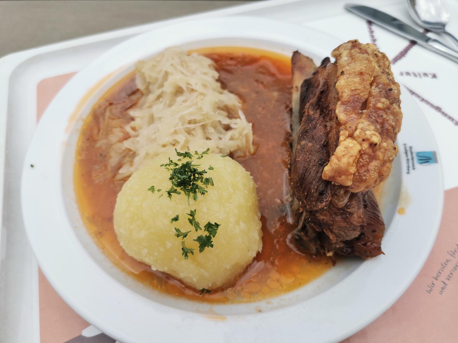 | Natürlich nicht das beste Schäuferla, das man je gegessen hat. Aber ein Grund, sich darauf zu freuen. War noch saftig, die Kruste trotzdem knusprig und nicht zu hart. Soße schmeckte eher nach Majoran als nach Kümmel. Leider musste man das Kraut extra zahlen. 4.5/5, ein Grund, in die Mensa zu gehen. | |