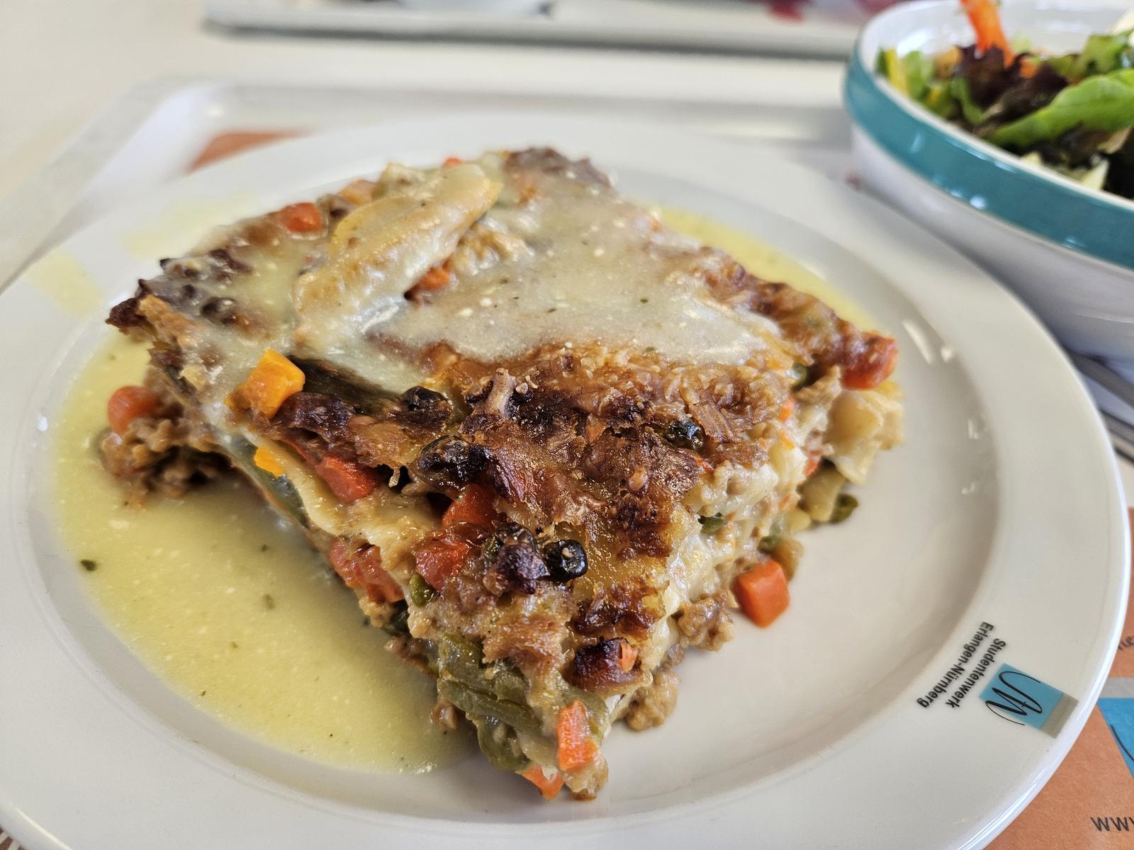 | Gabs diesmal mit Kartoffeln. Für mich eines der besten Geschnetzelten der Mensa. Natürlich kann man keine medium Filetspitzen erwarten, aber es hatte gute Säure und die Pilze waren frisch. Hat 4/5 Sternen verdient. Die Portion war sogar so reichlich, dass ich es nicht aufessen konnte, obwohl es gut war. | |