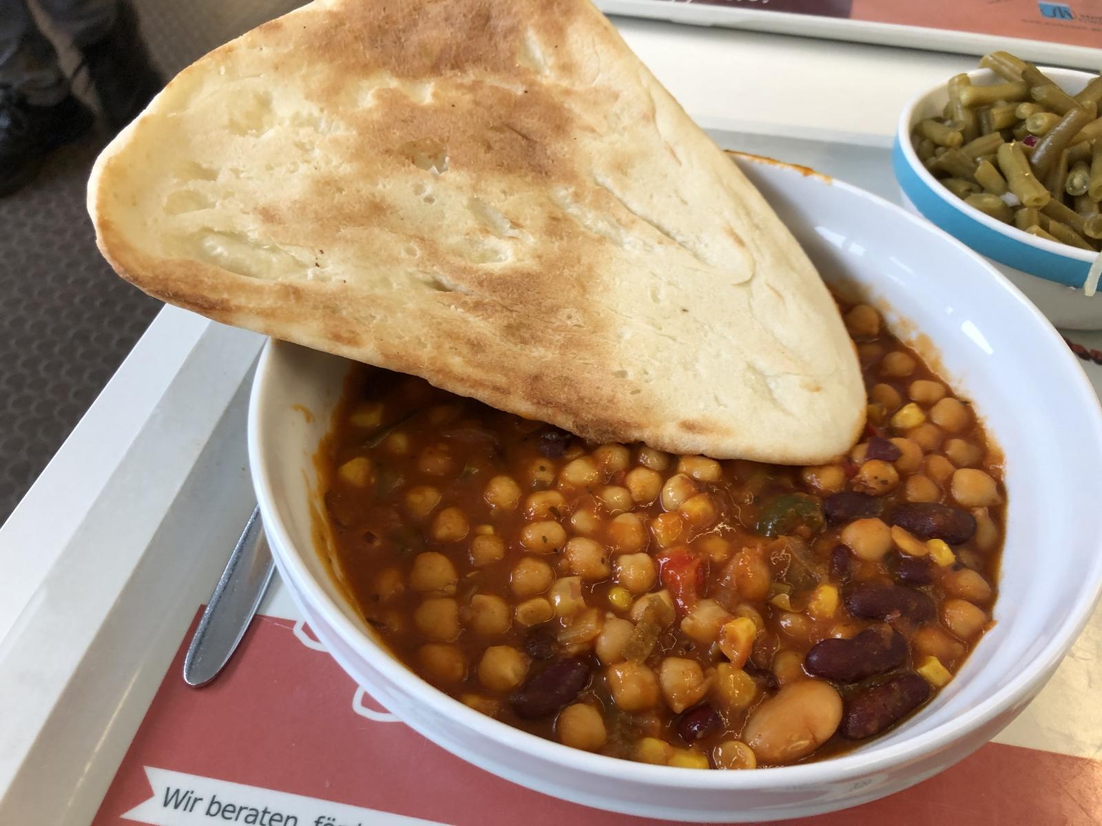 | Ich find‘s gut, dass die Mensa abwechslungsreiche Menüs anbietet, und auch mal ausgefallene Sachen wie dieses Kicherebsenchili. Aber insgesamt hat es irgendwie nicht gemundet. Das Chili hätte länger ziehe müssen, so dass sich die einzelnen Geschmäcker bzw. Gewürze besser mischen, d.h durchziehen. Und auch Naanbrot habe ich schon besseres gegessen. Die Mühe Top, die Umsetzung Flop. 3/5 | |