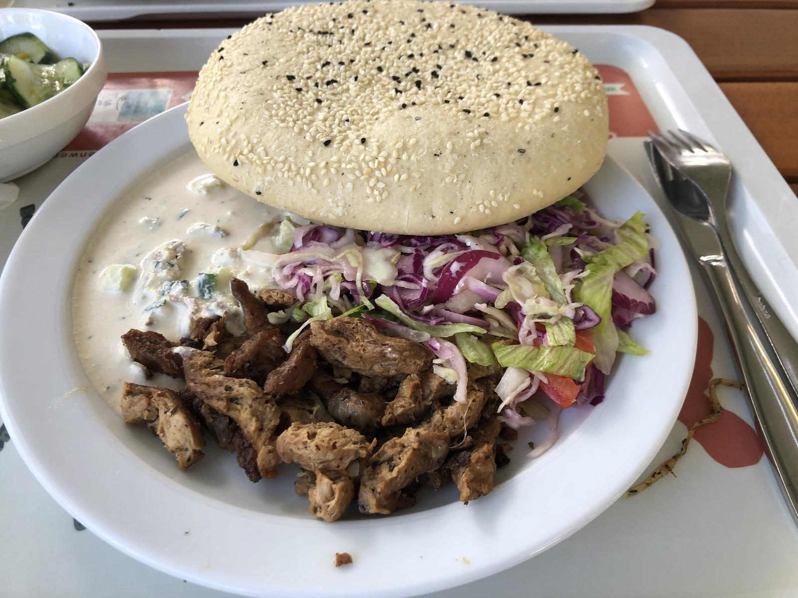 | Der vegane Dönerbausatz ist zwar immens überteuert, aber er schmeckt besser als der restliche Schlonz. Immerhin muss man als Mitarbeiter nur 5,43¤ blechen und nicht 8,44 für Gäste… Ein Döner an der Dönerbude wäre da günstiger (und deutlich besser). | |