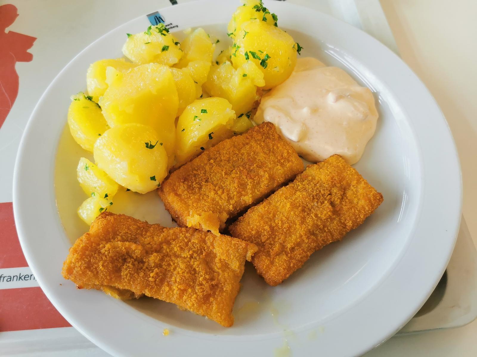 | Wenn es etwas länger liegt löst sich die Panade. Die Mayo war heute leider sehr flüssig, Immerhin waren die Kartoffeln heute gut. Mit Salat gings, 3/5, unterer Standard | |