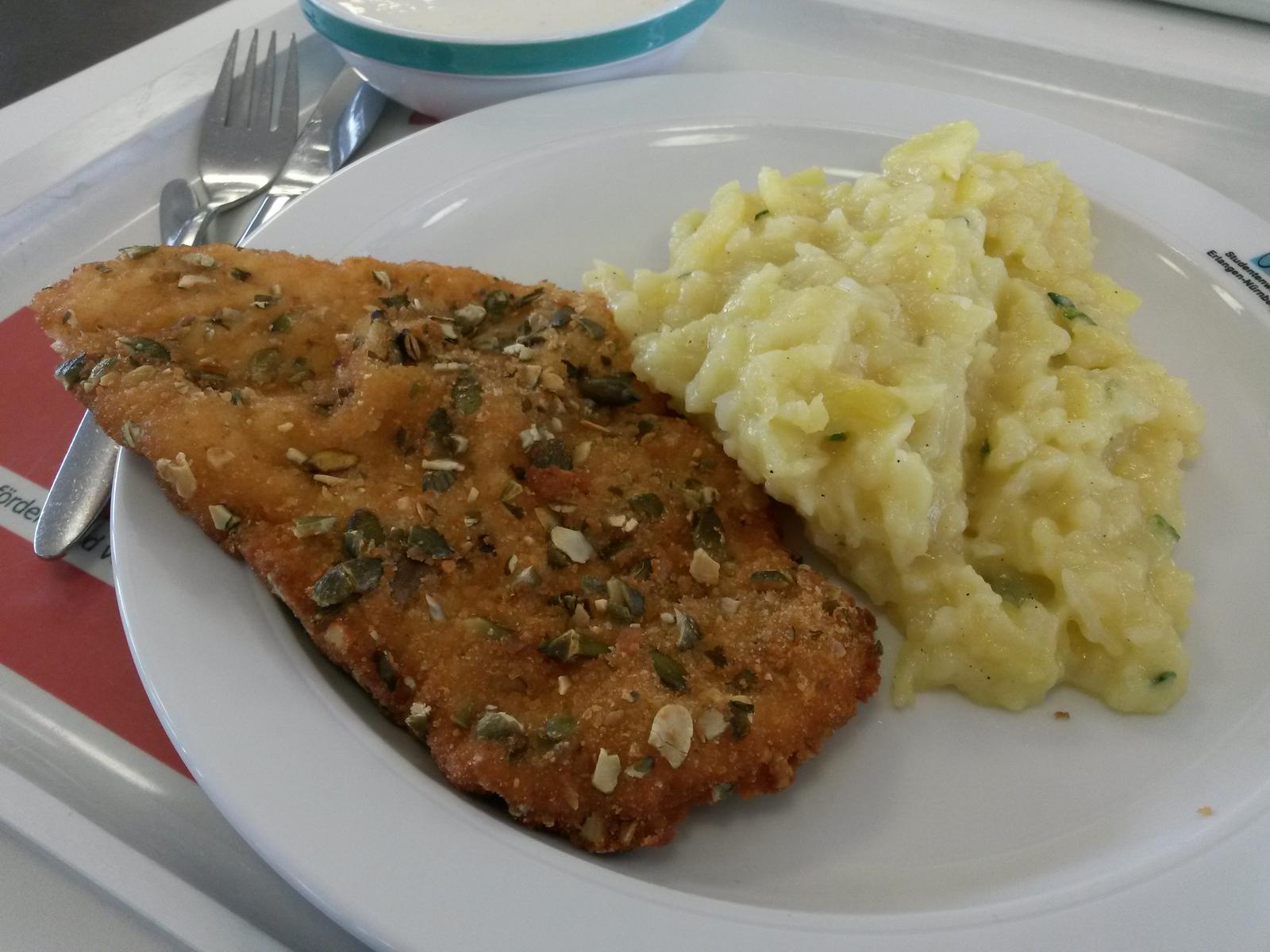 (126)| Zart, knusprige Panade, schmackhaft was will man mehr? Wirklich essbar, nur den Mensa Kartoffelsalat muss man mögen. So müsste es immer sein. | |