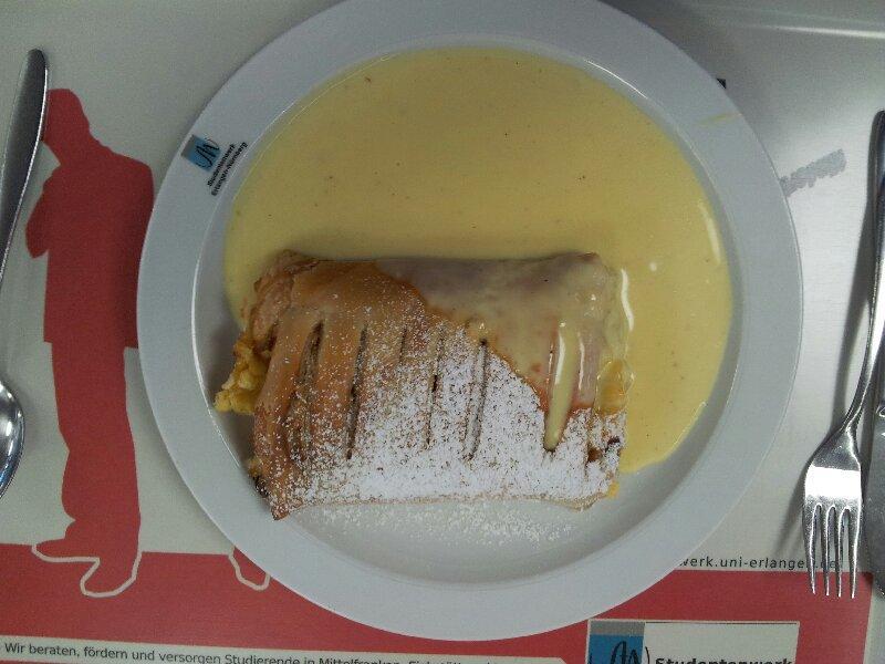 | Bisher war der Apfelstrudel einer der Lieblingsspeisen in der Mensa, aber diesmal hat er sehr komisch geschmeckt. Danach ging es mir nicht so gut, vermutlich weil es unfassbar viel Zimt darin war... Jedenfalls gab es den Strudel bisher immer portionsweise wie auf dem Bild hier, und diesmal hat man einen Großen in Stücke geschnittenen serviert. Falls ich das nächste Mal diese Stücke sehe, würde ich den Strudel nicht nehmen. | |
