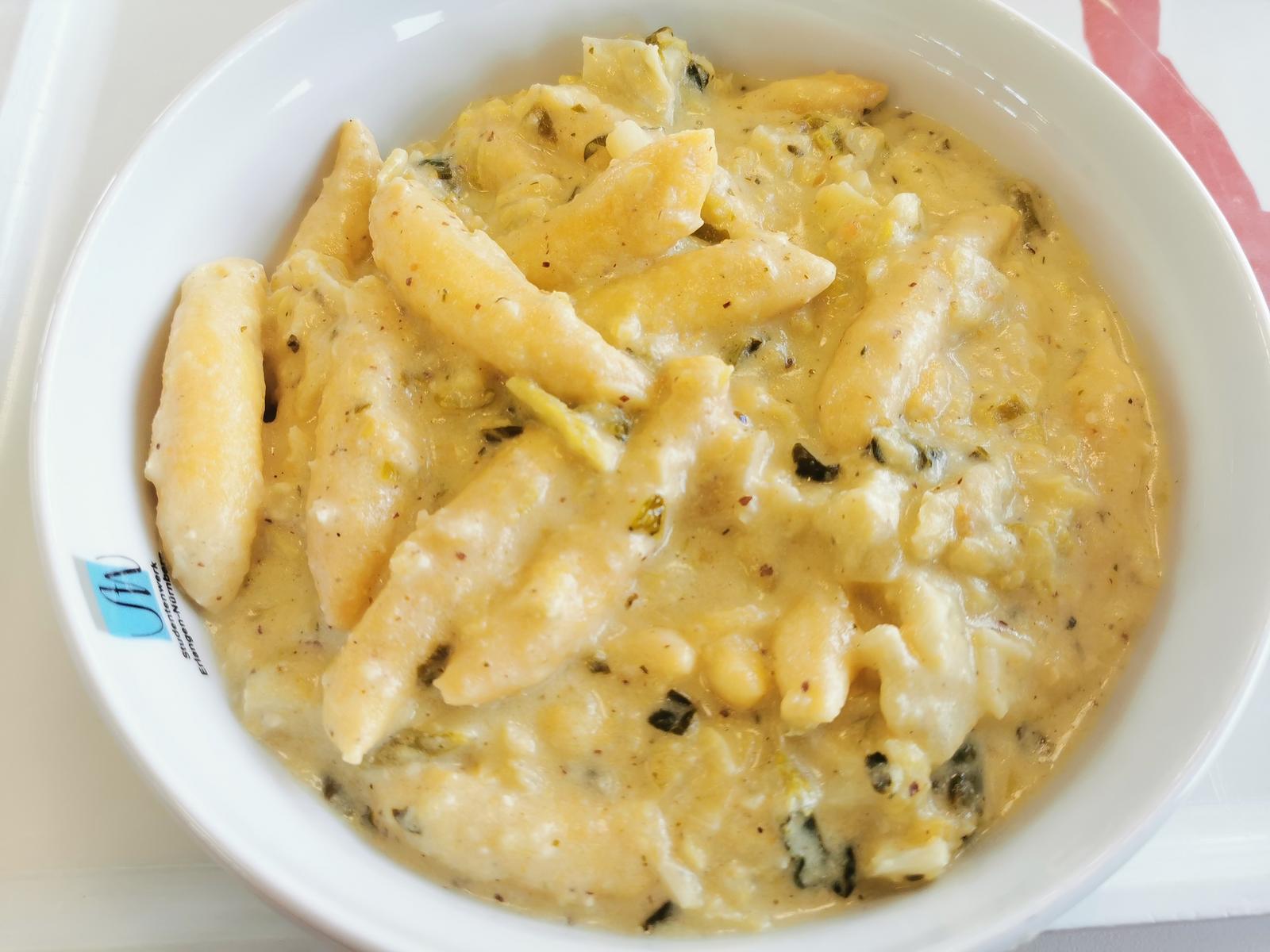 | Es war halt dar übliche Matsch bei Schupfnudelgerichten. Geschmacklich war die Soße ok, aber am Wirsing wurde gespart. Sowohl an Quantität aber auch an Qualität, denn der harte Strunk wurde anscheinend mit reingeschnitten. 3/5, gegessen aus Mangel an Alternativen | |