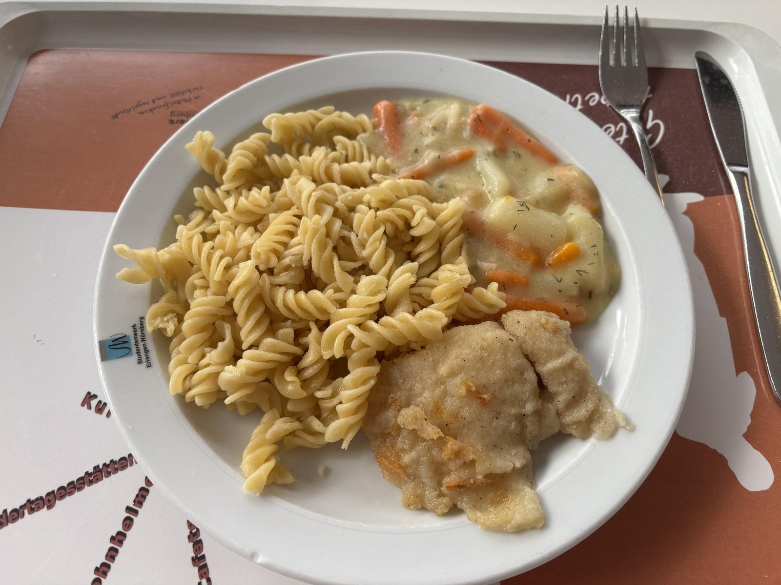 (102)| Der Fisch ist geschmackvoll im guten Sinne (wer das nicht mag, sollte auf die panierte Pappe am Freitag warten), das Gemüse gut gewürzt und nicht verkocht. Insgesamt echt geil für Mensa-Verhältnisse. | |