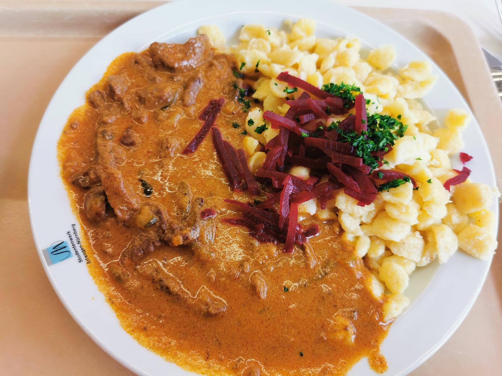| Gabs diesmal mit Kartoffeln. Für mich eines der besten Geschnetzelten der Mensa. Natürlich kann man keine medium Filetspitzen erwarten, aber es hatte gute Säure und die Pilze waren frisch. Hat 4/5 Sternen verdient. Die Portion war sogar so reichlich, dass ich es nicht aufessen konnte, obwohl es gut war. | |