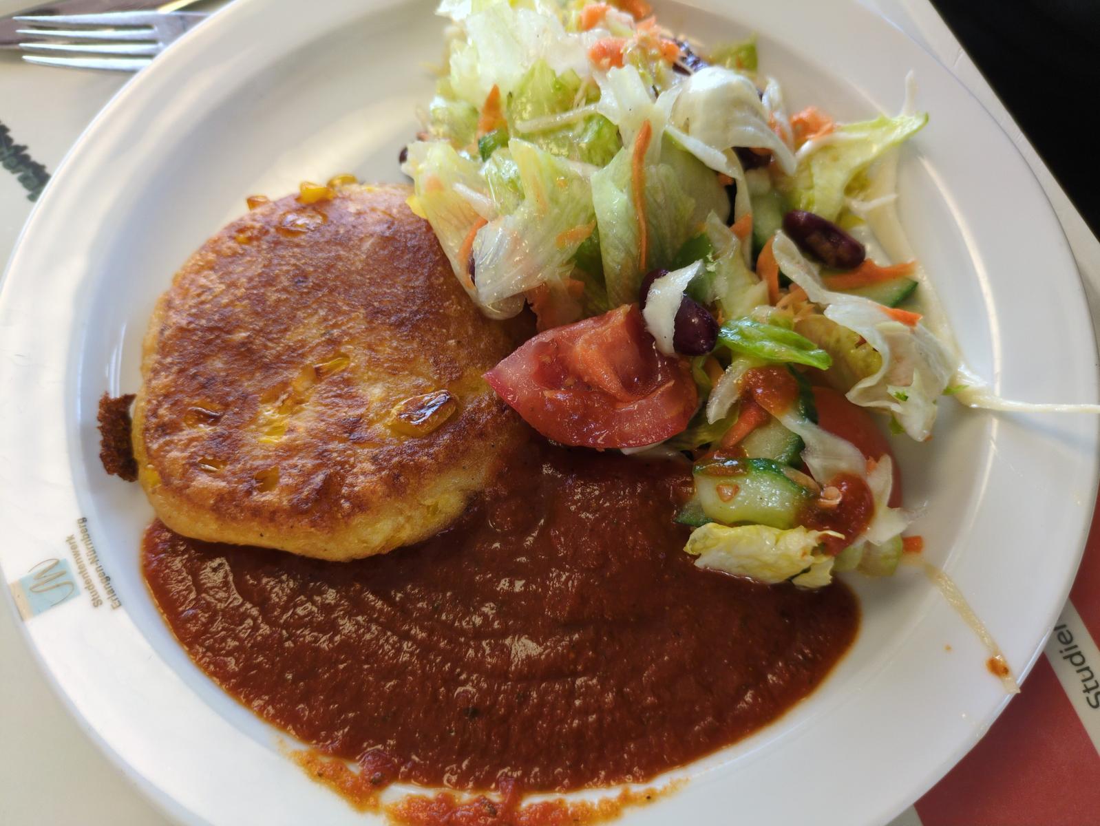 | Die Idee war gut. Das Tomatenchutney war leicht spicy und der Salat interessanter als der Standardsalat. Trotzdem nur 3/5, denn heute hat es an der Ausführung gehapert. Die Salatsoße weichte den Kartoffelpuffer auf und dieser war außerdem an einer Seite verbrannt. Möglicherweise hatten andere mehr Glück. | |